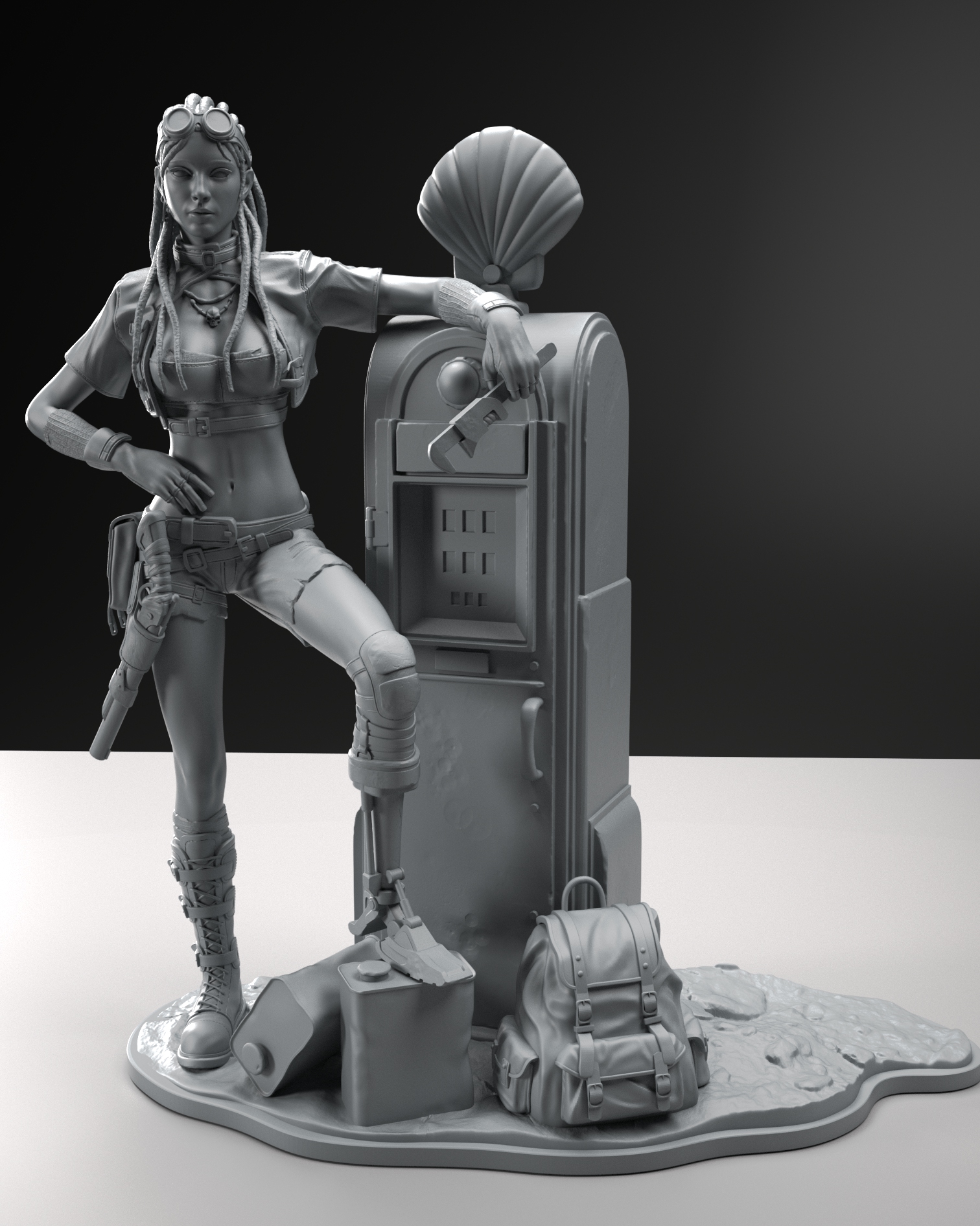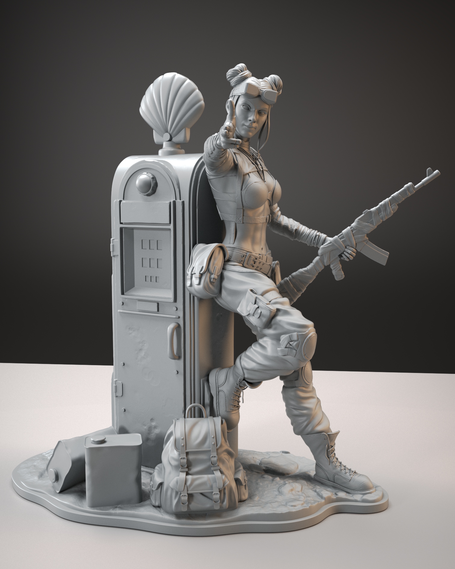 After their parent’s death, the young twins had to learn the hard way to live in a post-apocalyptic world. Karmun is the little genius of the twins, while Ottya is here to handle security. In this scene, There’s looking for some remaining gas in this old Shell gas pump.
